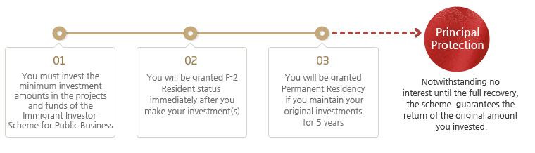 The Immigrant Investor Scheme for Public Business is the government program that allows foreigners who satisfy the investment requirements designated by the Minister of Justice to obtain F-2 resident and F-5 Permanent Resident status. For instance, those that have invested the minimum investment amounts or more in Korea and their families will be granted F-2 Resident status, and if they successfully maintain the investments for the next 5 years, they will, also, be granted permanent residency.