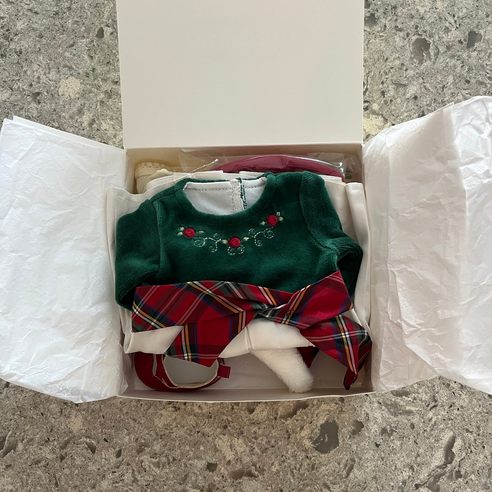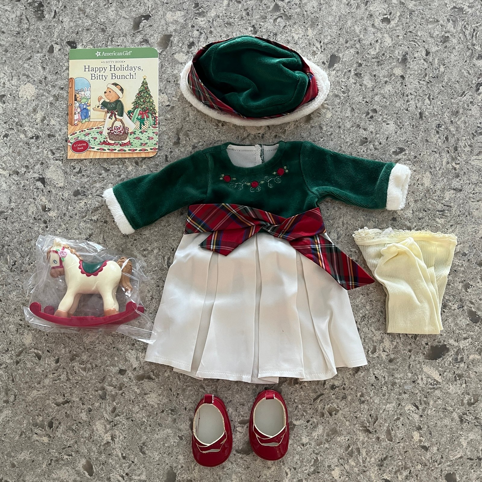 American Girl Bitty Baby Evergreen Holiday Set new in original box. The set is complete and the outfit was removed from the box for photos only.