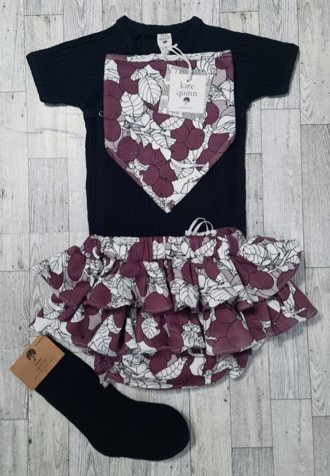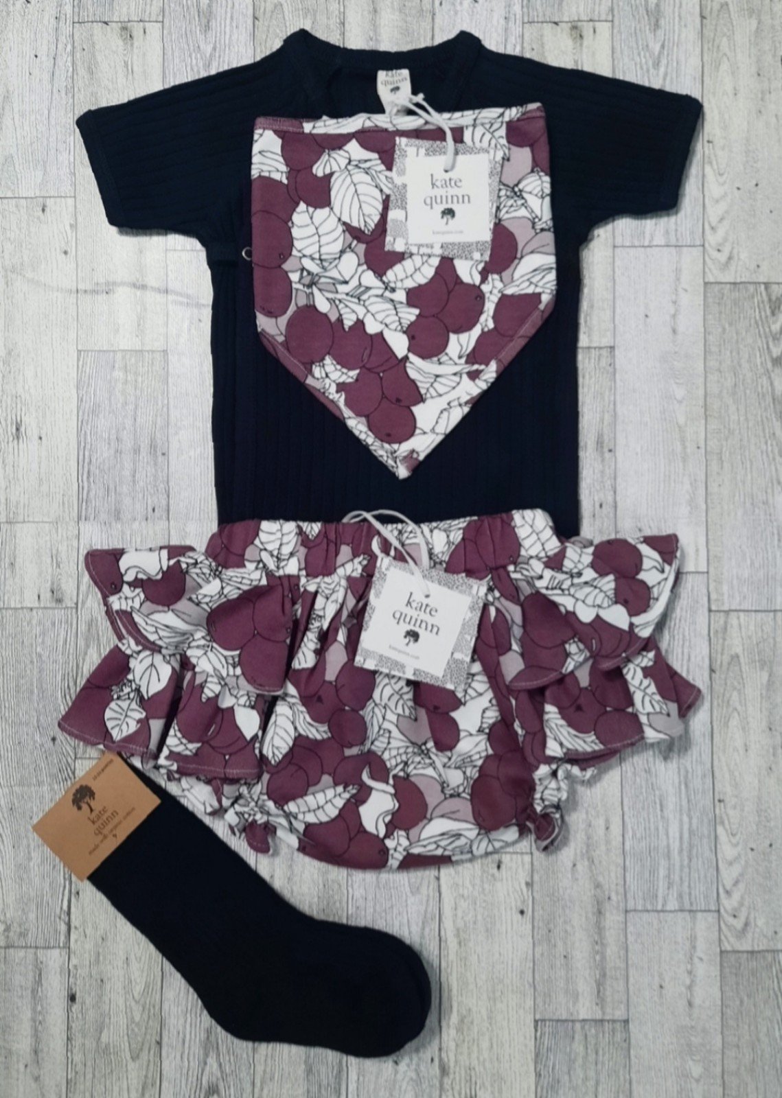 Short Sleeve Wide Rib Wrap Bodysuit, Double Ruffle Bloomers, Knee High Socks, and Matching Bandana Bib